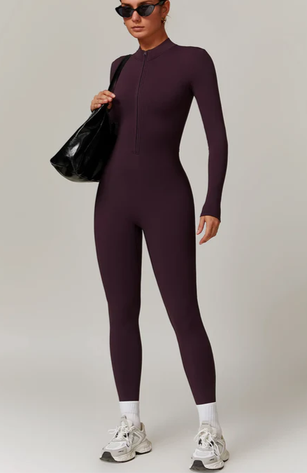 The ZipSculpt Jumpsuit is a sleek, one-piece design with long sleeves, high compression, and a front zipper — built to move with intensity and style.